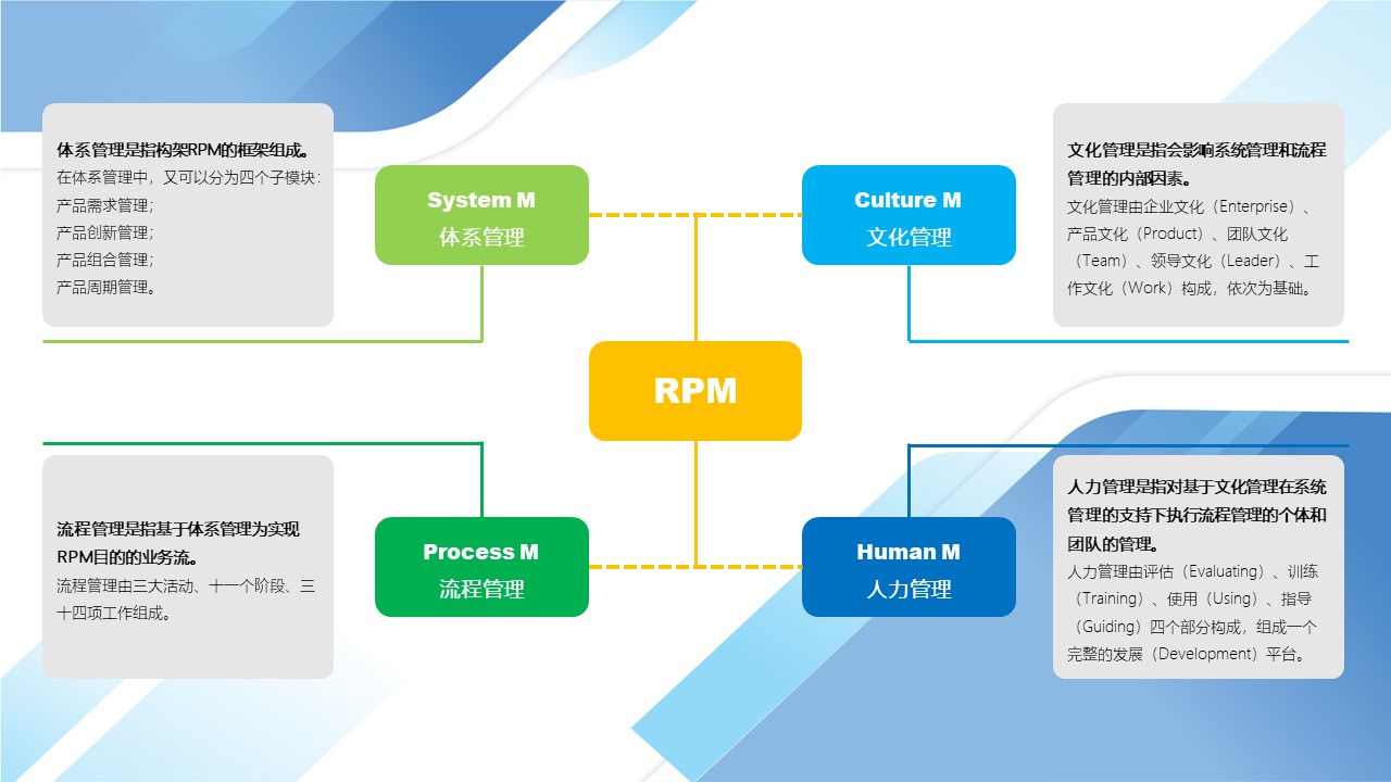RPM模型是由UCPM和CPRC通过多年实践,基于产品管理本质和现实的中国企业现状研发而成。在该模型中,共分为四个子体系:
